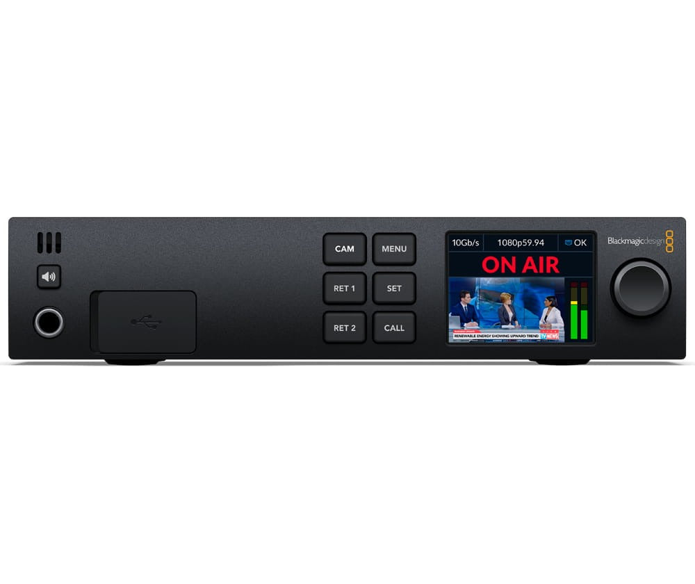 With 10G Ethernet on the Pro model, you can connect all signals to the camera with the one Ethernet IP link connection. That means the camera feed, return program feed, timecode, reference, tally, talkback and control are all sent down the single cable. That's the same benefits of SMPTE fiber, but the standard 10G copper Ethernet cable is much lower cost. The Blackmagic Studio Converter allows breakout of all the video, audio and talkback connections at the studio end. It also includes a massive power supply that powers the camera down the Ethernet cable, so you don't need a power source near the camera. Plus you can fit 2 per rack unit using a Blackmagic Universal Rack Shelf!